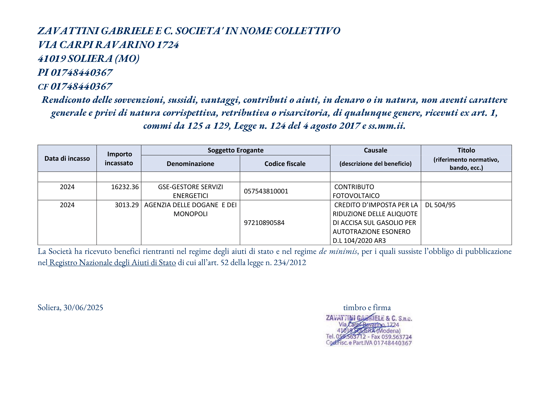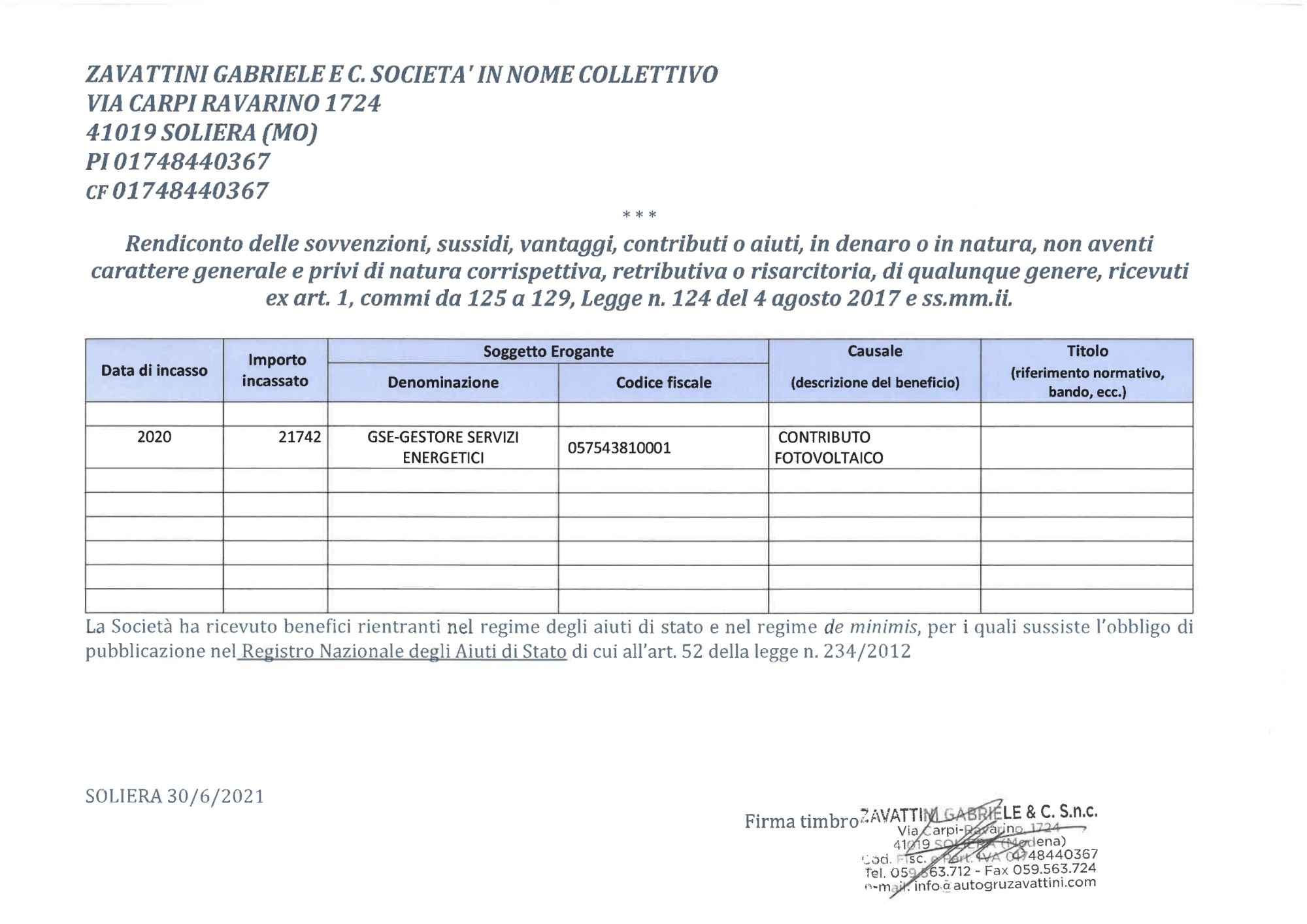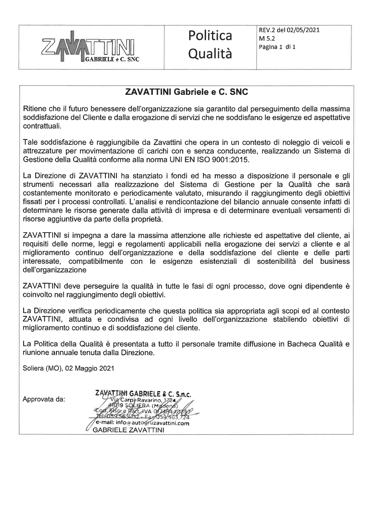 I dati personali da Lei inseriti, sono trattati da ZAVATTINI GABRIELE E C. – Via Carpi Ravarino, 1724 – 41019 SOLIERA(MO) – 059 563712 per finalità connesse alla fornitura dei servizi da Lei richiesti (a titolo esemplificativo: richiedere informazioni, registrarsi al sito per ricevere vantaggi e offerte, ottenere preventivi, effettuare pagamenti, acquistare beni e riceverli presso un domicilio da Lei indicato, effettuare una prenotazione, scambiare documenti).